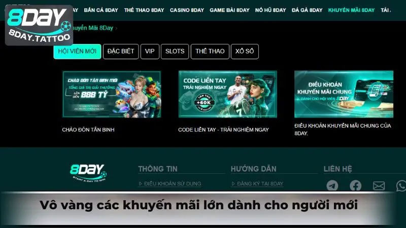 nhà cái luôn xây dựng hệ thống khuyến mãi dành riêng cho mỗi thành viên cực giá trị. Khi bạn đăng ký tài khoản 8Day, bạn sẽ được chào đón các sự kiện như nhận tiền cược miễn phí, tặng thưởng với lần nạp đầu tiên,..
